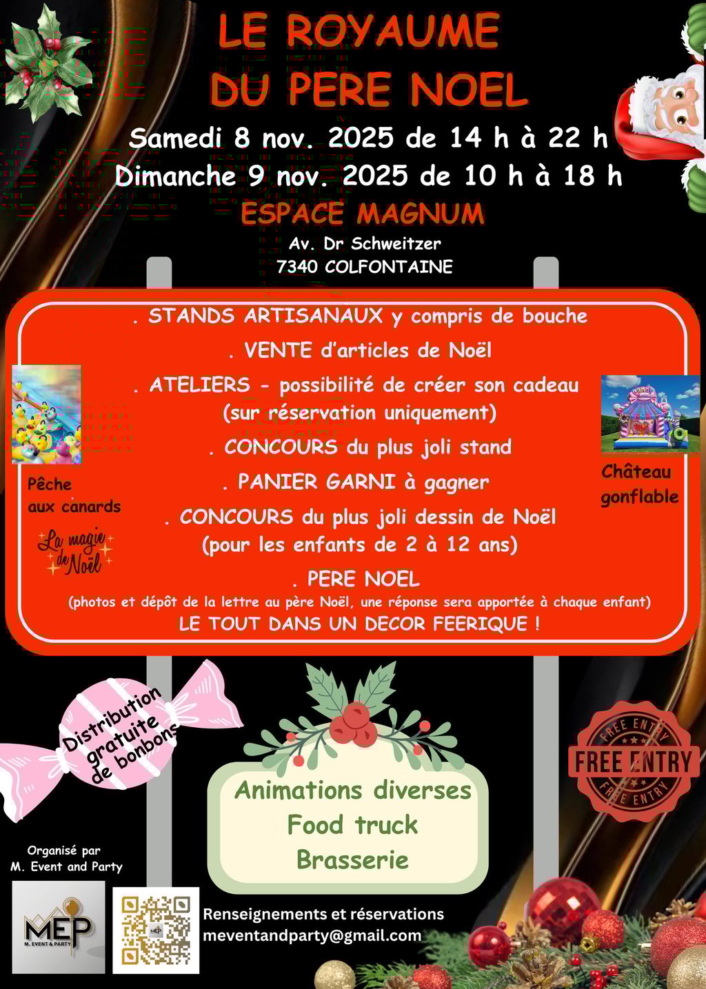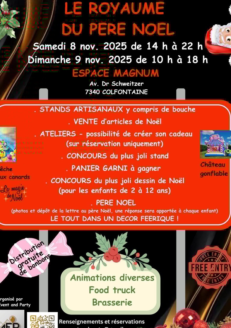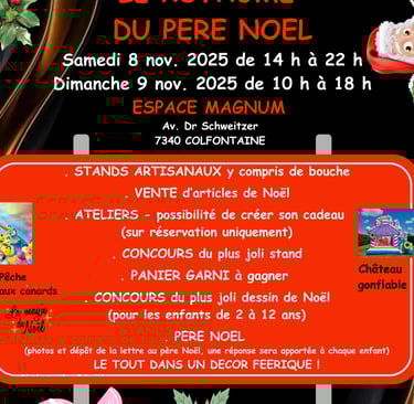 Chers amis et passionnés d’univers féeriques, nous avons le plaisir de vous annoncer notre présence au Royaume du Père Noël de Colfontaine, les 8 et 9 novembre 2025.